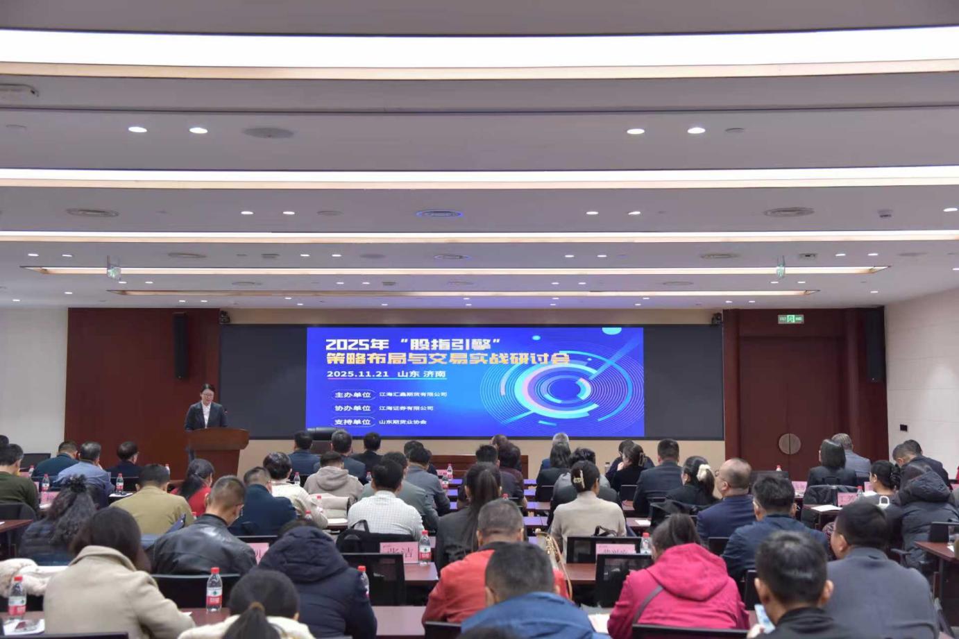 11月21日,在山东省期货业协会支持下,由江海汇鑫期货有限公司主办、江海证券有限公司协办的“2025年‘股指引擎’策略布局与交易实战研讨会”在济南财金大厦举办。山东省期货业协会秘书长李相民,济南金控集团党委副书记、江海汇鑫期货党总支书记李伟琰以及江海汇鑫期货主要领导出席本次会议。活动采取线上线下相结合方式,参会总人数近200人。