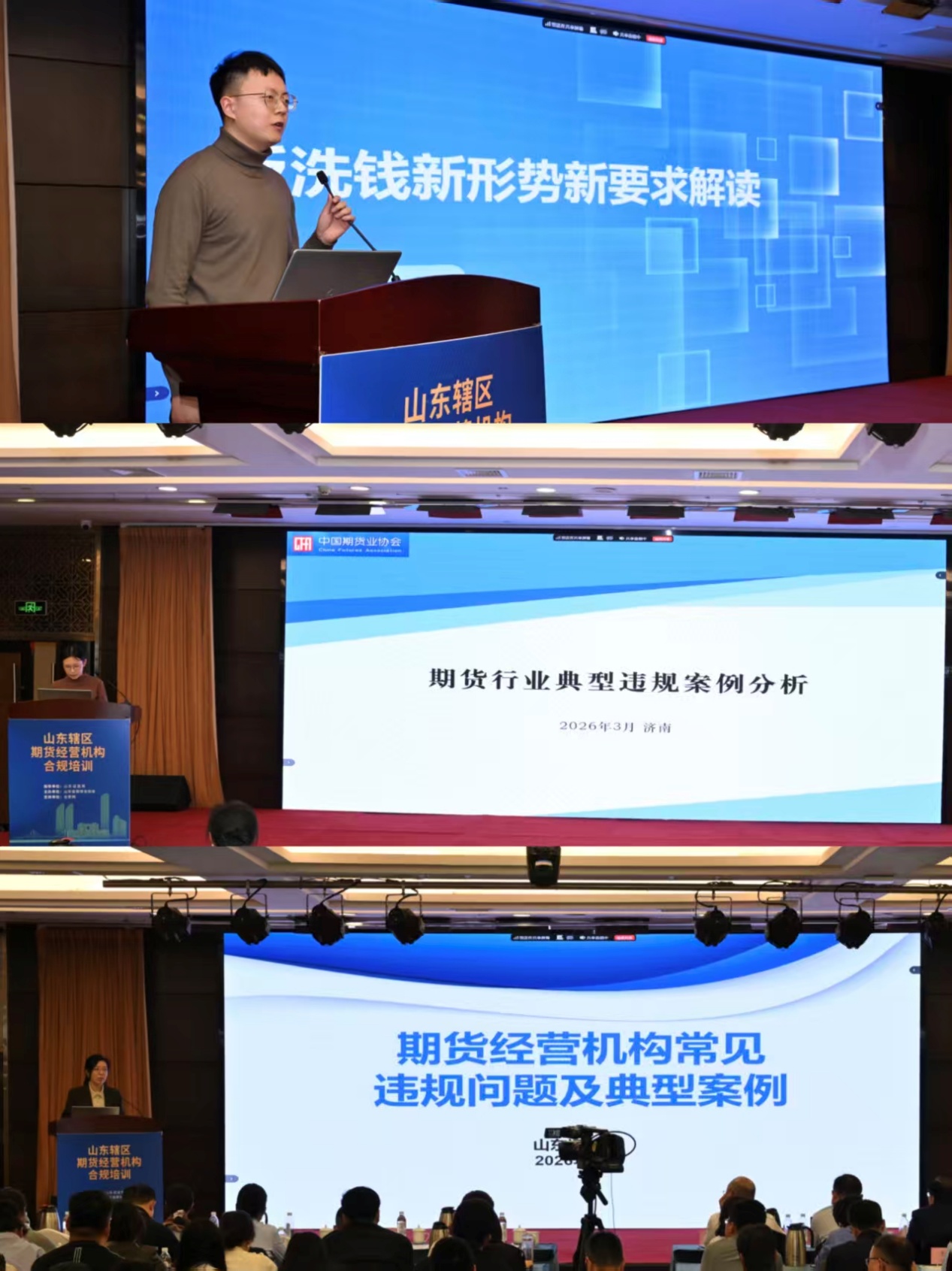 为进一步提升山东辖区期货经营机构合规管理水平,夯实从业人员合规意识和专业素养,3月24日,在山东证监局指导下,山东省期货业协会在济南举办2026年山东辖区期货经营机构合规培训。培训以线上线下相结合方式开展,辖区期货法人机构及期货公司风险管理公司董事长、总经理、首席风险官、合规部门负责人,以及期货分支机构负责人等150余人现场参会,线上累计观看1.31万余次。